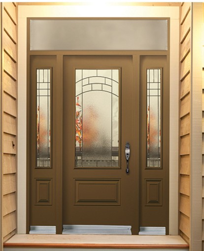 The Paragon front door glass insert is the perfect fit for homeowners seeking traditional style with an arched flair. Granite and clear beveled glass meet an arched accent, drawing the eye upward. Beveled granite glass in the center offers privacy bordered by clear bevel glass, creating the distinctive styling of Paragon. The Paragon glass insert is available in Black Patina caming. Request a free quote on the Paragon door glass insert today!